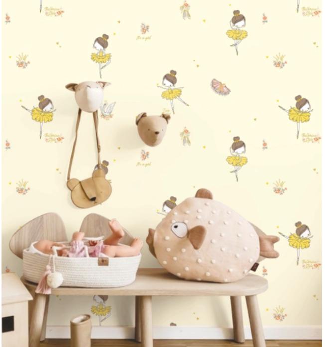 Adorable nursery wallpaper featuring cute ballerina animals in soft yellow tones.